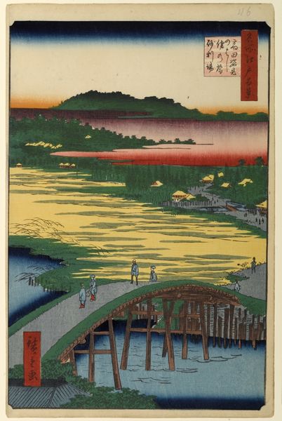 This woodblock print of the Zōjōji Temple and Akabane was created by Utagawa Hiroshige. Dominating the composition is the red pagoda, a symbol deeply rooted in Buddhist cosmology. This architectural form, moving from India to East Asia, signifies the sacred mountain, the axis mundi connecting the earthly and spiritual realms. The pagoda's tiered structure echoes the cosmic mountain, embodying the universe's layers and guiding the eye upward, aspiring for enlightenment. Consider how the structure echoes the Tower of Babel, a staircase to heaven. Here, the bridge, a humble architectural device, has a far more profound resonance in our collective unconscious: a passage, a link between states of being, visible here as a literal and figurative connection to enlightenment. Just as these symbols evolve and adapt, so too does our understanding, influenced by the currents of history and culture, proving that human expression is eternally resonant and transformative.