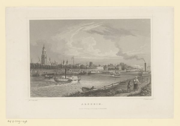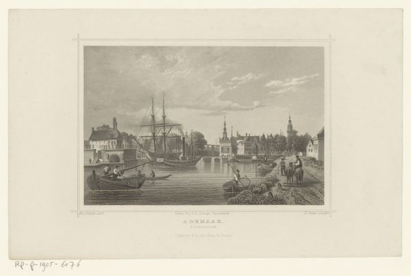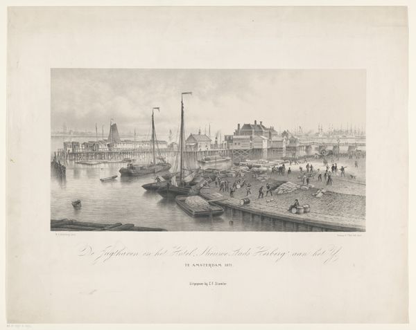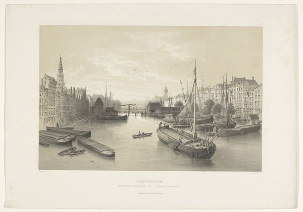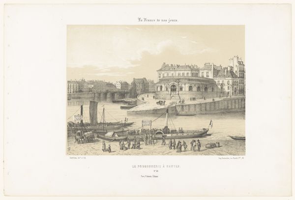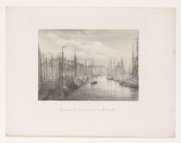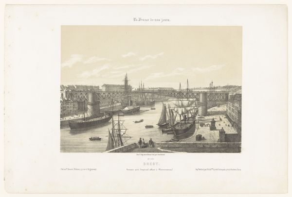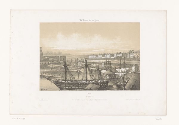 Léon Auguste Asselineau created this view of the harbor dock of the Loire in Nantes using lithography. The composition employs a delicate balance of horizontal and vertical lines, creating a serene yet structured depiction of the bustling port. The buildings lining the waterfront are mirrored by the masts of ships, creating a rhythmic pattern. This division suggests a dialogue between land and water, industry and nature. The texture of the sky, achieved through subtle gradations of tone, contrasts with the intricate detailing of the ships and architectural structures. The print invokes a sense of modernity, signified by the inclusion of a steamship. The interplay of light and shadow enhances depth and reinforces the sense of space. This artwork encapsulates a moment of transition, where the traditional maritime world meets the burgeoning industrial age. The formal elements invite us to consider how technological progress reshapes both our physical landscapes and cultural identities.