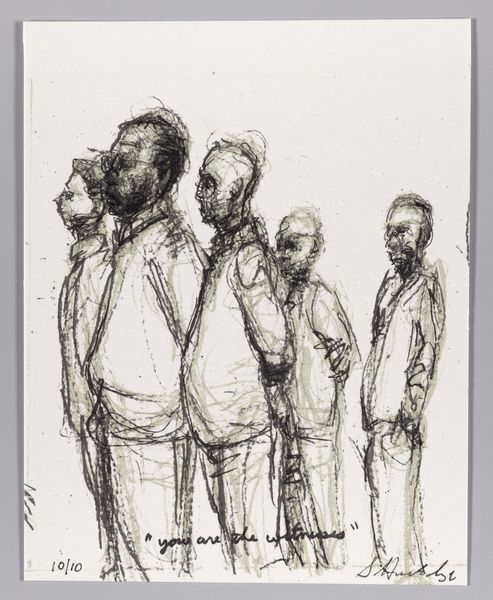 Editor: Here we have “Argumenterende mannen bij een biljarttafel” – Arguing Men at a Billiard Table – a pencil drawing by Henk Henriët, created sometime between 1913 and 1945. The sketchiness makes it feel unfinished, yet the figures are full of life, even theatrical. How do you read the symbolism in a piece like this? Curator: The upraised fist immediately grabs attention. In Western art, that’s loaded. What does that gesture evoke for you? Editor: Resistance, maybe? Power…but also potential violence? Curator: Exactly. And context matters. The image appears around the period encompassing two World Wars; this seemingly mundane scene of men around a billiards table transcends genre, turning into a symbol of social and political unrest. How do the other men factor into that reading? Editor: One's leaning in, seemingly engaged in the… argument? Debate? And the other is passive, almost as if to be saying "Here we go again..." Curator: It speaks volumes about the society’s mood during conflict and reconstruction. Even leisure, like a game of billiards, couldn’t escape the pervading tension and the pressing need for discussion, or, perhaps, protest. Does the simplicity of the medium – a humble pencil drawing – influence your interpretation at all? Editor: I think so, it's almost journalistic. Curator: Indeed. Stripped of colour, raw and immediate, as if urgently documenting a pivotal moment. It bridges the personal and the political, capturing the undercurrents of an era through everyday encounters. Editor: So it's not just men arguing in a billiard room, it’s a snapshot of a society grappling with its demons. Thanks, I'll definitely look at Henriët's work differently now. Curator: And hopefully see echoes of those tensions, arguments and resistances whenever you see a raised fist from now on!