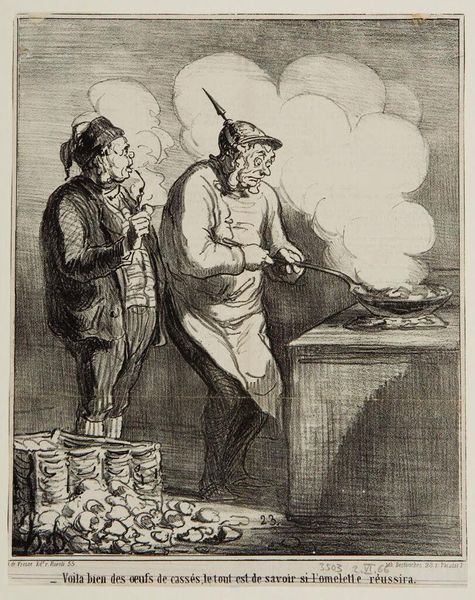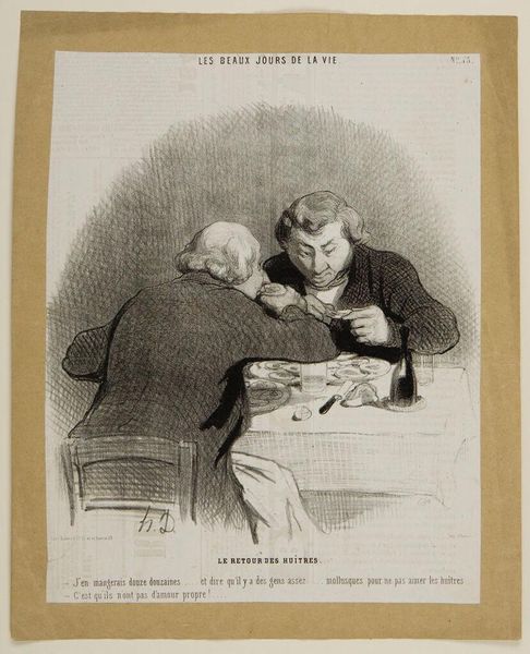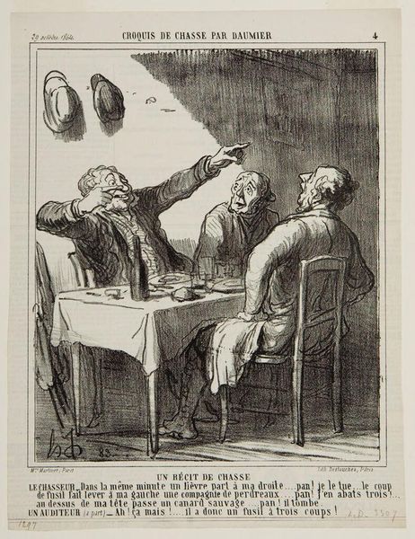 Curator: This intriguing lithograph is titled "A Guest at a Dinner of Horsemeat Eaters," created by Honoré Daumier. Editor: Well, that's certainly a direct title! The guest on the left looks absolutely horrified. The harsh lines and stark contrast give it a sense of grotesque unease. Curator: Indeed. Daumier, born in 1808, often used his art to satirize Parisian society. This work likely comments on the economic hardships that led people to consume horse meat. Editor: It's such a powerful image. The horse's head on the platter – it's both fascinating and deeply disturbing. You can almost feel the guest's stomach churning. Curator: Daumier adeptly uses caricature to highlight social issues, making this more than just a dinner scene; it's a commentary on desperation and societal norms. Editor: It really lingers, doesn't it? A simple yet stark reminder of how art can reflect uncomfortable truths.