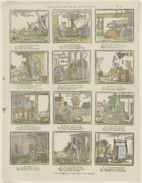 Curator: At first glance, this piece feels quaint and instructional, like a visual guide from a bygone era. There's a definite storybook quality to it. Editor: Indeed. What we're observing is "Let wel, kinderen! en bemerkt, / Hoe vlas en lijnwaad wordt bewerkt," a print drawing in ink by Christiaan Jacob Schuyling, created sometime between 1820 and 1838. Its title translates to "Take note, children! and notice / How flax and linen are processed." The print uses a comic strip structure with the purpose of instructing. Curator: Yes, the grid structure immediately creates a sense of order and narrative flow. The lines are clean, and the compositions within each panel are simple, almost elemental. Look at how the limited color palette—mostly subdued greens and browns—enhances the work’s sense of clarity. The drawing highlights its graphic quality; I find the materiality of the work quite beautiful. Editor: Considering its historical context reveals additional layers. Schuyling likely intended this as an educational tool, framing labor processes for children within a developing capitalist system. Each step is neatly visualized: plowing, harvesting, spinning, weaving—connecting these manual activities to larger themes of industry and societal progress. The final image of the woman and the completed cloth symbolizes the result of all these processes; It's also a direct visual link to labor as women’s work, and the domestic as inherently tied to larger markets. Curator: The simplification of form also aids legibility; this piece could be decoded easily even without any knowledge of reading, emphasizing the idea of universality through accessible imagery. It speaks volumes about how a straightforward formal technique facilitates understanding—almost like an early infographic, in a way. Editor: Exactly! This points to something crucial: how art can shape and transmit cultural values and encode different forms of labor within a given culture. Schuyling gives us more than a glimpse into a way of seeing labor and production in the Netherlands in the early 19th century; his art illuminates the connection between aesthetics and the political, economic and societal currents that flow beneath them. Curator: Absolutely, observing these narrative decisions offers insights into this artist's methods of conveying knowledge through careful sequencing. Editor: And by acknowledging those artistic choices, we’re equipped to confront what his didactic cartoon reflects.