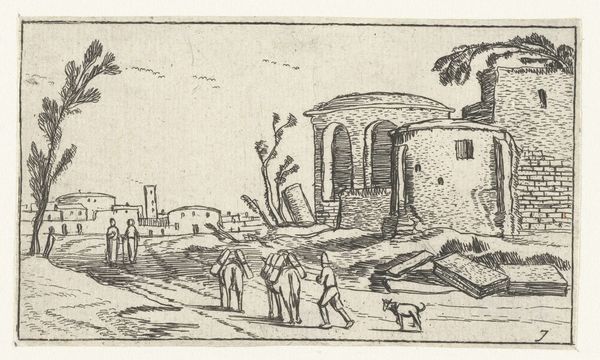 Editor: We're looking at Jacques Callot's "Herdsman and Ruins," a diminutive etching. The contrast between the solid herdsman and the crumbling architecture intrigues me. What formal elements stand out to you? Curator: Note the artist's command of line—the etching's visual rhythm. Observe the verticality of the buildings, juxtaposed with the herdsman's leaning posture and the horizontal landscape. Callot creates depth through the density of lines and their strategic arrangement. Editor: It's like the lines create the forms. I'm seeing the interplay of light and shadow much more clearly now. Curator: Precisely. The density describes form and the use of line directs our eyes. The formal structure creates an intriguing visual harmony.