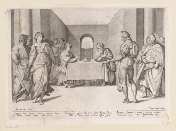Editor: We're looking at "Christus tussen de schriftgeleerden in de tempel," a print by Raffaello Schiaminossi from around 1602-1604. It's housed at the Rijksmuseum. The detail is really striking, but there’s something a little unsettling about all these serious faces. What stands out to you about this work? Curator: The power dynamics on display are what grab me. Here, we see a young Christ, positioned as an intellectual and spiritual disruptor in the temple, engaging with established religious authority. Consider how the artist portrays the power structures of the time, the young challenging the old. How might we read Christ's presence as a critique of entrenched power? Editor: It's interesting you mention power. I see the scholars looking almost wary, a bit put out by this young person challenging them on their own turf. Curator: Precisely. It raises questions about knowledge itself: who gets to define it, who is excluded from its interpretation, and how dominant narratives are challenged. We must consider this engraving in its historical context of religious and intellectual reform, asking if it implicitly advocates for alternative interpretations of scripture. What sociopolitical undercurrents do you perceive that could be informing Schiaminossi’s rendition of this Biblical scene? Editor: Well, maybe it's about the need to question authority, especially when it seems unyielding. And the youthful, almost vulnerable figure of Christ adds another layer; it challenges the notion that wisdom comes only with age and status. Curator: Indeed. And note the positioning and gazes— who holds direct eye contact and who averts. It's about more than a simple debate. Consider, also, the potential gendered reading, considering that theological scholarship at the time was predominantly male-dominated, although not universally so. Does Christ's youth and possible androgyny add an intersectional aspect? Editor: I never thought about it that way! I was mostly focused on the immediate scene, but understanding the broader societal influences gives the artwork so much more depth. Curator: Exactly! The real art lives in its ability to spark these conversations across time.