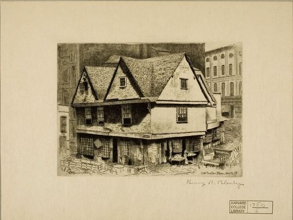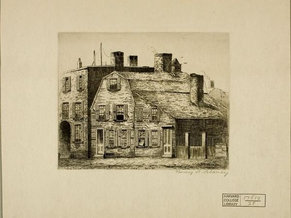 Curator: Let's turn our attention to Henry Robertson's etching, "Old House, Creek Square, No. 20," currently residing at the Harvard Art Museums. Editor: Oh, it gives me the shivers! That rickety old building looks like it's about to crumble into the creek. I can almost smell the damp wood and forgotten stories. Curator: Indeed. Robertson, who lived from 1891 to 1974, seems to capture a moment of urban decay. Etchings like this often served as a commentary on the changing urban landscape and the plight of older structures amidst modernization. Editor: I see that. There's a definite sense of melancholy, like witnessing the last stand of something beautiful and broken. The detail is incredible, every line seems to tell a tale of neglect and resilience. Curator: Exactly. Consider how Robertson's technique—the precise lines, the stark contrast—highlights the building's vulnerability and its persistence, speaking to broader anxieties about progress and preservation. Editor: Right. I will remember how even ruins can be strangely comforting, echoing our own imperfections and fleeting existence. Curator: A fitting reflection, I think.