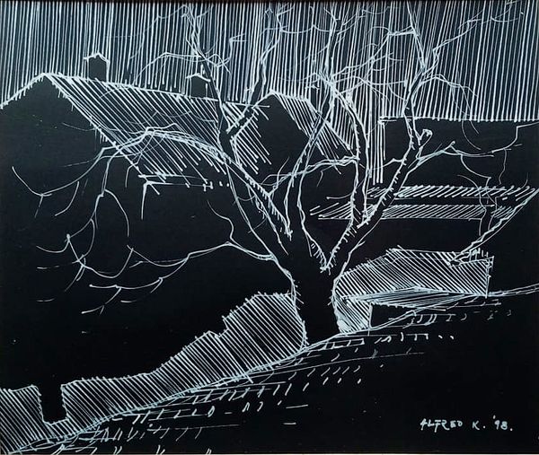 Editor: This is "Karlovac at night. A view from the Kupa river," a 2007 ink drawing by Alfred Freddy Krupa. It’s a strikingly simple composition; just white lines on a black background. I’m curious about your perspective, what do you see in this piece? Curator: This work prompts us to consider the very essence of drawing and its place in contemporary art. Krupa’s choice of ink, applied so minimally, challenges the traditional hierarchy that often privileges painting. The black support is not merely background, but a critical material agent, its mass playing against the fragile lines describing the cityscape. What labor is being expressed here? Is it about observation or representation? Editor: It’s interesting how you focus on the materials. It makes me think about the act of drawing itself. Like, why ink, why these minimal lines? Curator: Precisely! Consider the social context. Krupa’s practice embraces what some might dismiss as simple or preliminary— a sketch. By elevating this, he critiques the commodification of art. He's showcasing the labor of seeing and recording, not just the finished product. What is lost, and what is gained, in such starkness? Editor: I hadn't really considered the ‘labor of seeing.’ The roughness of the lines actually makes me focus more on the atmosphere, that particular stillness you get at night. Do you think the limited materials affect our interpretation of the place? Curator: Absolutely. The artist purposefully utilizes humble means. Is this an exercise in democratic image-making? Is it an invitation to observe beyond conventional beauty, pushing us to value the immediacy of experience and the bare bones of artistic creation? Editor: Thinking about the labor involved and the commentary on art itself really deepens my understanding of what’s at play here beyond just the depiction of a cityscape at night. Curator: Yes, considering the materials, their application, and the implicit commentary woven into their use reveals the artist's complex dialogue with artistic production. It underscores art not as a detached object, but as embedded within economic and social structures.