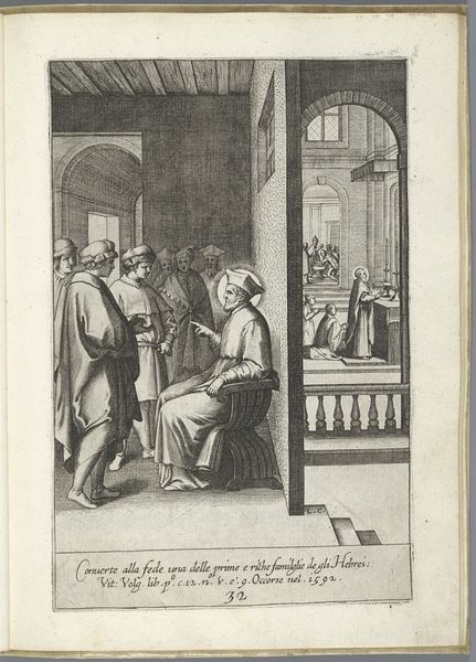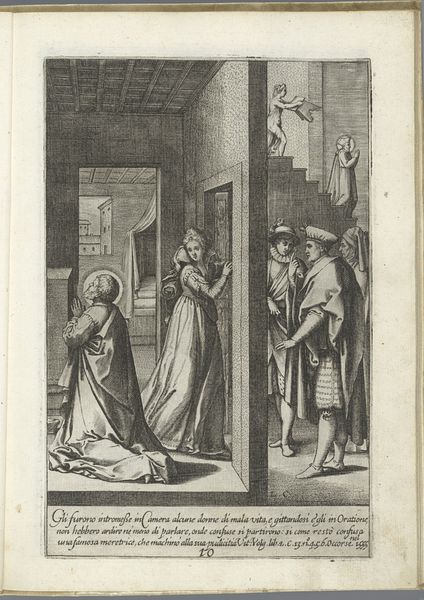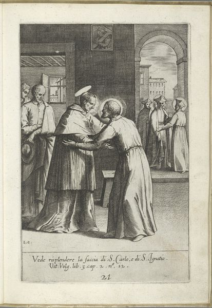 Editor: This is "Filippo Neri sees the future of two men," an engraving by Luca Ciamberlano, created sometime between 1630 and 1641. It's housed in the Rijksmuseum. The scene feels very staged, almost like a theatrical production, especially with the architectural backdrop. What compositional elements stand out to you? Curator: Immediately, I observe the stark contrast created by the strategic use of light and shadow. Notice how Ciamberlano directs our gaze using line. The lines of the architecture – the arches, the columns – converge, creating a sense of depth. What effect does that have, combined with the composition of figures? Editor: I see, it pushes our focus toward Filippo Neri. His posture and the placement of his hand leading towards the two kneeling men directs attention to that interaction. So, the lines create depth and highlight the main action? Curator: Precisely. Further analysis of the engraving reveals how Ciamberlano uses a limited palette to maximize visual impact. The variations in texture, created solely through the density and direction of the engraved lines, are crucial. Does the limited use of color lessen the symbolic interpretation in your view? Editor: I initially thought so, but the varied use of light does bring out depth in the garments of the figures which in turn seems to help reveal details such as facial expression. I guess the composition supersedes the use of color here. Curator: Indeed, through an austere style, a captivating visual experience has been constructed, highlighting the central subject in an appealing way. Editor: I see what you mean; now I understand the engraving is more about the structural composition than symbolism, as I first thought. Curator: This close examination allows for the appreciation of formal elements.