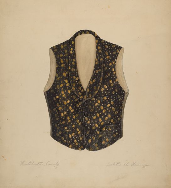 Editor: Here we have Carmel Wilson’s watercolor drawing "Vest," from around 1937. It's a rather detailed depiction, and something about the rendering feels quite formal. What symbols or imagery strike you in this work? Curator: The vest itself speaks of social stratification and ceremony; it’s not merely clothing but an indicator of status and occasion. Note the intricate floral embroidery – these aren’t just decorations. They evoke heraldry, families, lineages, possibly referencing hidden narratives or aspirations embedded within its wearer's identity. And, what do you think of the somewhat ghosted quality of the vest, especially compared to the more solid treatment of the embroidery details below? Editor: Interesting, the floral details almost act as calling cards for specific meanings. And the vest… faded? Perhaps representing how traditions and social meanings also diminish over time? Curator: Precisely. Consider also the context of 1937; anxieties about tradition versus modernity were particularly sharp. Clothes become a way of preserving, or even reinventing, the past in response to societal shifts. How does this interplay between garment and era make you feel? Editor: I suppose it suggests a yearning for stability during a turbulent period. Seeing how these symbols create deeper meanings definitely adds to the initial formality I felt. Curator: Exactly! Every brushstroke contributes not just to visual representation but layers historical, social, and personal narrative – inviting reflection on memory and cultural identity. Editor: Thinking about "Vest" in that light really opens up how we read even everyday objects as loaded with symbolism. Thanks for sharing your insights!