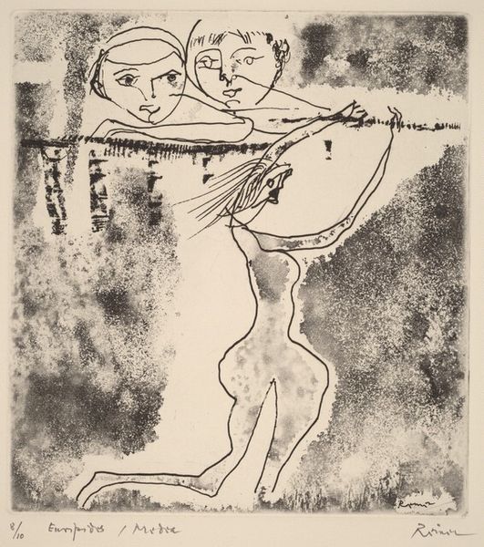 Curator: Imre Reiner's 1964 work, "Shakespeare/Sommernachtstraum," realized in ink and printmaking techniques, is a captivating piece. Editor: It certainly is...immediately striking in its stark, dreamlike quality. The figures seem suspended, barely tethered to the ground. Curator: The composition is fascinating, isn't it? The dense, textural background plays against the delicate linework of the figures, creating a dynamic visual tension. Note the strategically placed moon. It really draws the eye. Editor: Yes, but I find myself considering the labor involved in its production. The visible etching lines—evidence of the artist's hand and the pressure applied to the plate. It is really beautiful and strange to see an adaptation using the media of printmaking that really encapsulates this sort of ephemeral story. Curator: Absolutely, the materiality contributes to the work's aesthetic impact. Reiner is employing Surrealist conventions to tap into the realm of the subconscious. One sees traces of Klee's delicate figurations combined with a raw, expressive application of ink, thus speaking volumes about the emotional tenor of Shakespeare's comedy. Editor: And the reproductive nature of printmaking means this image could have circulated widely. Imagine this interpretation of Shakespeare influencing amateur productions, costume design, or even further artworks... It places "high" art directly in contact with popular culture and lived experience. Curator: An excellent point! I'm intrigued by how the linear simplicity gives it the haunting feel. Each stroke contributes not only to the form, but also to an overarching atmospheric reading that teeters between melancholy and whimsy. It is fascinating to consider that through semiotics and structuralist analysis this particular visual narrative evokes all of the Shakespeare play’s humor. Editor: For me, the appeal lies in seeing art move out of the gallery and engage with how people perceive the story. We get to understand the materiality, its methods of reproduction, and circulation among a wider audience and contexts for visual engagement. Curator: It’s hard to argue with the allure. I appreciate it all, and my analysis benefits greatly from yours. Editor: Thank you, the interplay between the material world and the emotional space creates, is endlessly thought-provoking to consider!