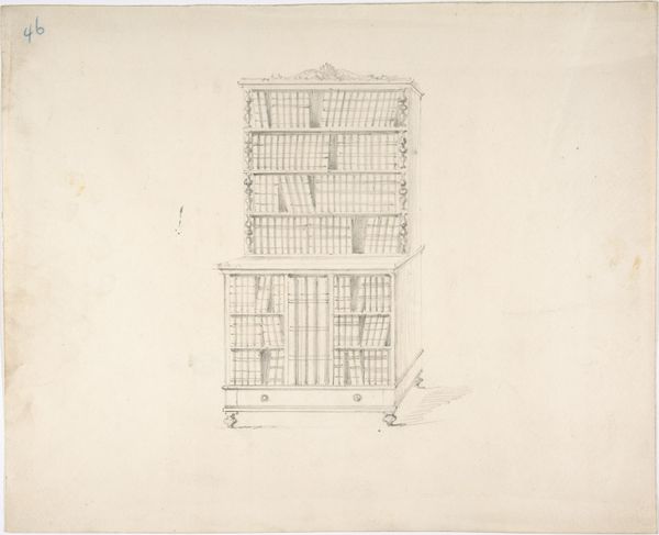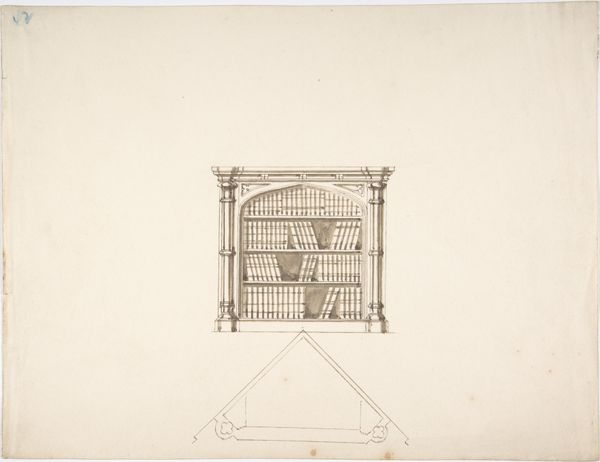 Editor: Here we have an intriguing design, "Design for a Gothic Style Corner Book Cabinet: Elevation and Plan," created between 1800 and 1850 by an anonymous artist. It's a mix of pencil, ink, etching, and possibly other media, detailing what looks like an architectural blueprint. What first jumps out is the sort of somber elegance; even as a sketch, the weight of historical and academic precedent is palpable. What symbolic elements stand out to you in this piece? Curator: The choice of Gothic style is deeply significant. Recall the Gothic period – associated with soaring cathedrals striving towards the heavens. This cabinet design appropriates that verticality, compressing it into a domestic setting. What psychological impact might that compressed aspiration have, do you think? Editor: Perhaps a constant, internalized striving for knowledge, made manifest in the domestic sphere? The books become a kind of personal cathedral. Curator: Precisely. Notice how the pointed arches, a signature of Gothic architecture, frame each shelf. They speak of enlightenment, of a gateway to knowledge. How does this contrast with the rise of Neoclassicism, another movement present at the time, with its own set of symbolism? Editor: Neoclassicism favored symmetry and order, a return to the 'rational' ideals of antiquity, didn't it? This design, while ordered, has a certain romantic flourish, a hint of medieval mystery absent from Neoclassical forms. Curator: Indeed. This drawing represents a fascinating tension between those aesthetic ideals. Look closely at the base - how do those curves at the corner relate to that overall verticality? Editor: Now that you mention it, that contrast in shapes feels like a struggle to reconcile groundedness with soaring intellect! I appreciate seeing the drawing as more than just a design for furniture; it really captures the intellectual climate of its time. Curator: And perhaps hints at the enduring human desire to find harmony between our earthly existence and our aspirational selves.