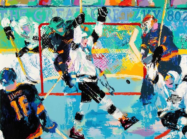 LeRoy Neiman made this of, who I assume is The Great Gretzky, with paint, though when exactly, is lost to time. What strikes me is how Neiman translates movement into static paint. Look at the materiality here, the way the thick paint sits right on the surface, capturing a sense of immediacy, as if the work was made in the heat of the moment. The painting isn’t trying to imitate reality, but, like, *become* it through a process of layering and mark-making. There’s this spot, just above Gretzky’s left shoulder, where the blue smears into the white, a real gestural passage. It's as if Neiman is saying, ‘Here’s the energy, here’s the blur of the game.’ Neiman reminds me of someone like Joan Mitchell, both artists pushing the limits of paint to evoke feeling and motion, and both understanding that a painting is never really finished, just abandoned at some point. It’s about the conversation between the artist, the paint, and the subject, a constant back-and-forth that ends up being more about the journey than the destination.