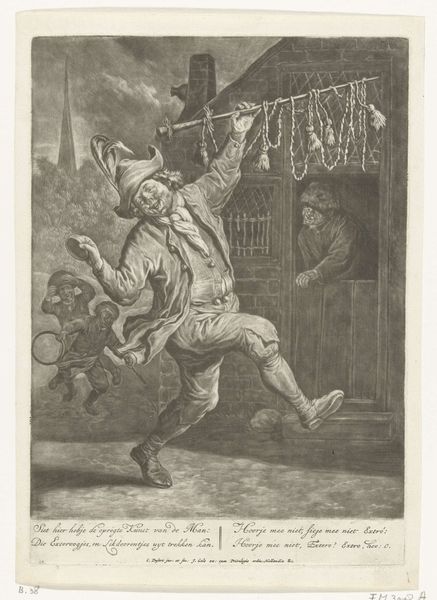 Curator: This is "Loterij van Grootebroek, 1694," an engraving by Cornelis Dusart here at the Rijksmuseum. What's your first impression? Editor: Utter chaos! Like a snapshot of absolute glee, except everyone looks just a little… tipsy. It's brimming with characters and bursting with an energy I can practically hear. Curator: Indeed! It captures a scene from a lottery announcement, a common public event in the Dutch Golden Age. These lotteries served not just as games of chance but as significant sources of revenue for local communities. Editor: Oh, interesting. It really feels like I’m stumbling into a real moment here. The light seems to dance on their faces and clothing… Curator: Dusart, who came from Haarlem, clearly sought to depict this excitement and frenzy. Look at how he used etching to emphasize particular textures—notice the detailing in clothing and even in facial expressions. The layering is superb for that effect, especially in a monochromatic work! Editor: He's definitely captured the kind of revelry where everything is just a bit too much – the raucousness and maybe the slight underlying anxiety about the odds, but mostly joyful optimism. It's infectious, like looking into a bygone party I desperately want an invite to! But do they always get this excited to hear about taxes? Curator: In a way, yes, public celebrations often coincided with important fiscal activities of a state; thus were integral aspects that unified both ruler and ruled with displays in communal cultural life, yes? Consider the lottery’s success in generating revenue at this time. By attending these festive announcements, people reaffirmed the social structure while expressing excitement with art itself playing a mediating, even conciliatory, role. Editor: Ah, so art, like laughter, making hard pills taste a little sweeter. A lot more thought was put into these announcements than I previously considered. Looking at this engraving gives you a genuine understanding, rather than merely reading accounts about those experiences; to connect back with these scenes makes for some true history! Curator: Exactly, capturing the moment within this historical lens illustrates a vital link across many components regarding seventeenth century economic activity intertwined through cultural expression. It certainly offers viewers now, through Dusart's skillful craft, a better vantage point. Editor: Absolutely. What began for me as some humorous observation shifted significantly by having that background knowledge. Suddenly I see it all now from those people's places, inside the happening, so vivid due entirely in due through this work that speaks even centuries after it came.