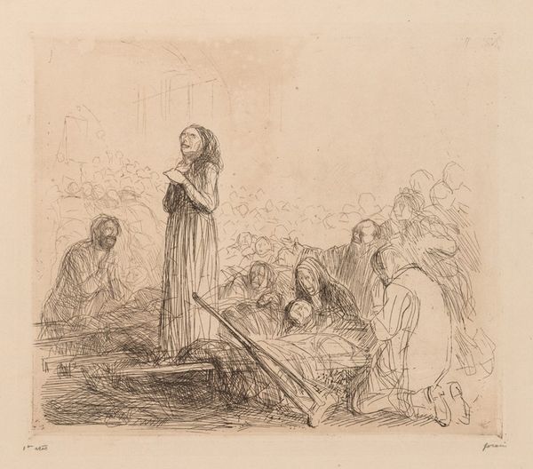 Jean-Louis Forain made this drawing of women in a bombed-out church confronting Christ, likely during World War I, using swift strokes of charcoal or graphite. There is a raw and immediate quality to the line, as though the artist felt compelled to record this scene urgently. The texture created by the smudging and hatching of the charcoal adds to the emotional weight of the image. Look at the way the figures emerge from the shadows, their faces etched with grief and anger. The lines are not precious; they are there to convey feeling, which really hits home. Consider the accusatory gestures of the women, their hands outstretched toward the figure of Christ. It’s a powerful moment. Forain was known for his social commentary, much like his contemporary Kathe Kollwitz. Both artists remind us that art can be a vehicle for empathy, forcing us to confront uncomfortable truths.