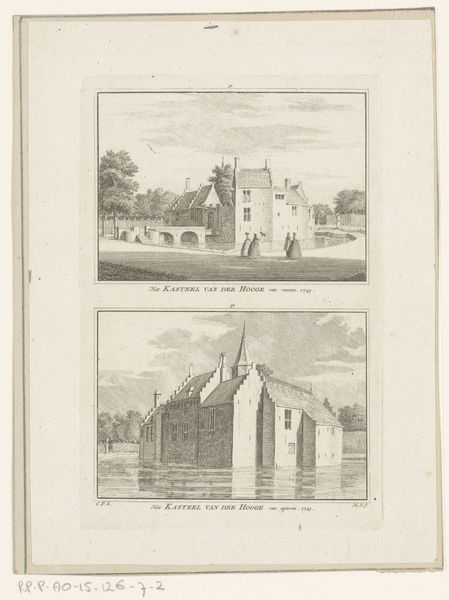 Editor: This is Hendrik Spilman's "Gezicht op Kasteel Aldegonde en gezicht op de kerk te West-Souburg, 1743," a print made with engraving on paper sometime between 1754 and 1792. The contrast is really striking! What's your read on this, seeing them together like this? Curator: Let's think about what it means to reproduce these structures via printmaking in the 18th century. Spilman isn’t just representing a castle and a church; he’s participating in a burgeoning visual economy. Who had access to these images? How did the act of engraving, this meticulous, reproducible labor, affect the value, the very perception of these buildings? Editor: So, less about the buildings themselves and more about their dissemination? The means of production influencing our understanding? Curator: Precisely. Consider the material differences between a hand-drawn sketch only a few could view and an engraving capable of wider distribution. This shift transforms architecture from unique, imposing structures to commodities circulated within a consumer culture. Think about the social hierarchies at play: who could afford these prints, and what did possessing them signify? What labour was required to create the copperplate, paper and final image? Editor: It brings a whole new dimension. I was just thinking about composition, but it is so much more that that! What sort of statements can we draw based on its materiality and its means of production? Curator: The controlled, repeatable lines of the engraving reflect an Enlightenment emphasis on order and reason, while simultaneously making those architectural visions accessible commodities for a specific class. Each impression carries with it the embodied labor of the engraver and all materials required, mediating our connection to the place. How might the image impact social identity or perhaps even be used as a social tool? Editor: That really challenges the idea of just viewing the aesthetic qualities of this print. It’s about understanding it as part of a larger economic and social machine. Thanks for the lesson! Curator: Indeed! By engaging with the material conditions of its production and circulation, we get a clearer sense of its cultural work. This isn’t just art; it’s a commodity with embedded social values and tangible labour.