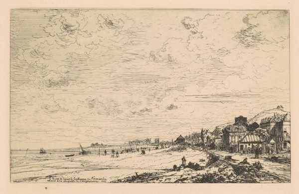 Curator: This pencil drawing is entitled "Gezicht in de vlakte van een landweg met een enkel huis," which translates to "View in the plain of a country road with a single house." It's attributed to Georges Michel and believed to have been created sometime between 1773 and 1843. Editor: Wow, that title’s a mouthful, isn’t it? The drawing itself has this hazy, almost dreamlike quality to it. Sparse but really quite evocative. A feeling of…loneliness, perhaps? Curator: Indeed, that sparse treatment and subdued palette contribute to its pensive atmosphere. Michel employs a keen understanding of spatial relationships, creating depth through subtle gradations in line weight. Note how the forms in the foreground possess more definition, fading into the distance. Editor: It's like my memories, clearer close up, fading with distance. I love the crooked fence posts, too. Adds a bit of character, a bit of imperfect humanity to it all. And what is it about isolated houses that pull on our heartstrings? Makes you wonder about the lives unfolding within those walls. Curator: Observe the composition closely. The artist directs the viewer's eye along the diagonal of the country road, eventually coming to rest at that centrally positioned structure. Its modest size speaks volumes regarding humankind’s relative insignificance within the broader landscape. A commentary, maybe? Editor: Commentary, or maybe he just liked the view! Either way, the composition really works. That little house is just enough to draw you in. I almost want to follow that road to see where it leads. To find what mysteries lie beyond the horizon! Curator: It embodies principles inherent to Romanticism: appreciation for natural beauty coupled with themes of solitude, introspection and reverence. Editor: Well, said! This small artwork is an interesting piece from another time. Curator: Indeed, the interplay between form and emotional expression render it a particularly strong work by Michel.
