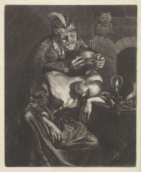 Curator: This piece, dating roughly from 1645 to 1705, is titled "Old Woman and a Boy with Candles," currently residing at the Metropolitan Museum of Art. It's rendered in printmaking, a drawing really, though the artist remains anonymous. The figures seem lit from within. Editor: Yes, it’s the contrast that immediately strikes me. The figures emerge from a dark, grainy background—it's not merely illumination but the raw, etched lines that give form to their faces and clothing. Curator: Exactly. Note the intricate hatching and cross-hatching, techniques to model form and create depth, particularly around the old woman's face, emphasizing its wrinkles, but also in the draping fabric of their clothing. Editor: Which leads to the process—I'm curious about the labour involved in achieving such detailed lines. Think about the hours spent etching on the metal plate to create this luminosity. It's a very labor-intensive medium that served to represent domestic light and its accessibility. Curator: Indeed, the light is paramount, isn't it? The faces are revealed in this soft, flickering glow. Notice how the positioning and juxtaposition creates visual rhythm between the two figures—each with a shared illumination. Editor: I read a sense of dependency within it, too. Who makes the candle, what materials were required to make it, and what is it burning to fuel are all questions of access and daily life that would reveal much about this period. Curator: It certainly allows for multiple interpretations; one might suggest this careful modulation symbolizes knowledge and passing the torch between generations, as implied through their interactions. Editor: Right. Thinking about the wick and wax though gives it an undeniable materiality—a candle transforms the physical to the ephemeral—fueling a social and even material encounter with their world through candlelight. Curator: Well, however you look at it, light animates these anonymous subjects—elevating this genre scene into something quite thought-provoking in both technique and affect. Editor: Absolutely—pondering its laborious construction makes you see the picture in a whole new light, revealing connections far beyond mere depiction.