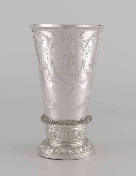 This Kiddush cup was made anonymously, and we can appreciate it for the way it elevates a common material - silver – to a special status. The cup is formed from sheets of silver, likely raised and shaped by hammering and then soldered together. The surface is simply decorated with etched lines, including the Star of David, a symbol of Judaism. The material itself, silver, has long been associated with value and purity. It’s a metal prized for its malleability, allowing it to be shaped into complex forms. The reflective surface adds to the cup’s precious quality. The making of this cup involves skilled labor. Even with simple tools, the silversmith would need to have trained to create the smooth, symmetrical form. Though we don't know who made this cup, we can imagine them taking pride in their craft, creating an object that would be used for generations. Considering the cup’s beauty, its social context, and the labor that went into its creation reminds us of the rich histories embedded within the objects that surround us.