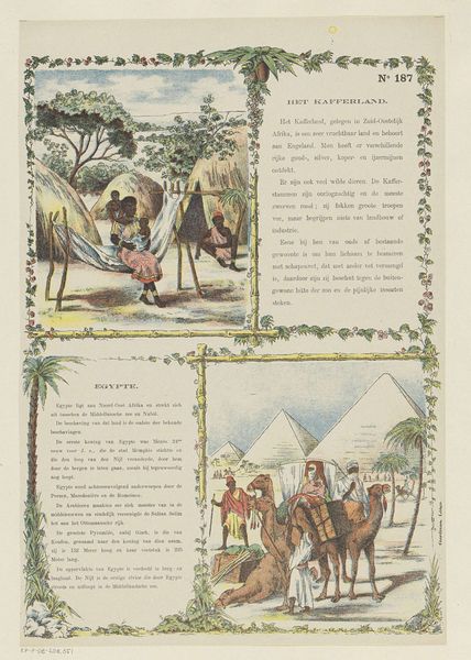This illustrated print, titled "De Congostaad / Soudan," presents scenes from the Congo and Sudan. Immediately striking is the depiction of river travel, where European figures are guided through turbulent waters by African rowers. Water, a symbol of life and chaos, here embodies both the promise and peril of exploration. Consider how such images resonate with classical motifs. The perilous journey across water echoes stories like the crossing of the River Styx in Greek mythology. Just as those ancient voyages symbolized a transition into the unknown, so too does this scene evoke the uncertainties and cultural encounters inherent in colonial expansion. But, observe how the waters are tamed by the boatmen. This conveys a powerful psychological narrative, presenting the colonizers as figures of reason amidst the perceived wildness of the landscape, subtly reinforcing a narrative of control and domination. The image thus becomes a potent carrier of cultural memory.