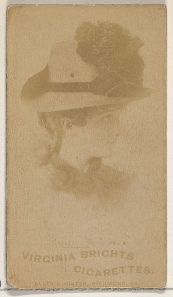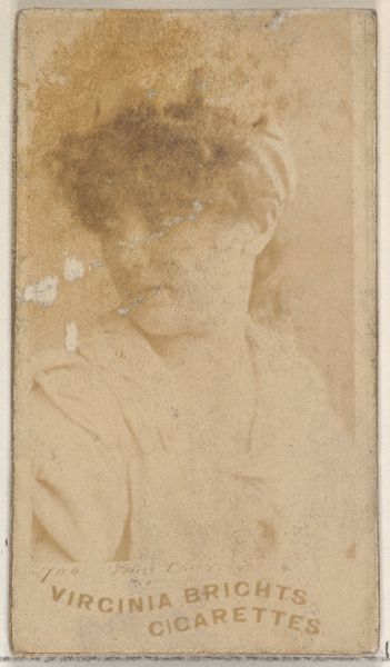 Editor: Here we have "Annie Robe, from the Actresses series (N203)," printed in 1889 by Wm. S. Kimball & Co. It's a combination of drawing, print, and photography on one card. Its aged condition lends an air of mystery. What formal qualities stand out to you? Curator: Primarily, it's the composition. The figure, though faded, occupies almost the entire vertical rectangle, establishing a clear figure-ground relationship. Note how the artist, even within the limitations of the tobacco card format, has suggested depth through the layering of costume elements—the hat, the dress, the suggestion of a collar. The monochromatic palette also merits attention. Editor: It's interesting how the limited palette emphasizes texture, especially in her hat. Do you find it compelling? Curator: Yes, the texture provides some visual variety against the otherwise homogenous light-brown surface. What this photograph may lack in clarity, it certainly makes up for through the contrast between form and the object. It becomes a question of whether this is merely a photograph or, as it would appear, an artistic statement concerning the artistic qualities of an actresses photograph. Editor: So the blurring almost abstracts her? Curator: Precisely. It invites contemplation on the interplay between representation and abstraction. Editor: This analysis really helps me see beyond just the surface. I am seeing it in a new light! Curator: Indeed. Formal analysis can open many doors, so we need to continue analyzing art this way to determine meaning, cultural intent, and potential political ramifications of these images.