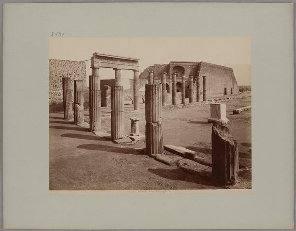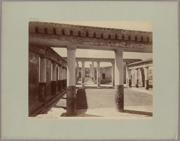 Curator: This photograph by Giacomo Brogi, dating from around 1880 to 1890, shows a view of the peristyle in the Domus Vettiorum, Pompeii. The image is an albumen print. Editor: It has such a serene, almost ghostly feel, doesn't it? The warm tones soften the stark ruins. I'm immediately struck by the heavy shadow work contrasting with areas brightly exposed with natural light that must've saturated this courtyard. Curator: Indeed. The albumen process allows for incredibly fine detail. Brogi likely saw value in documenting the space at the domestic scale in order to allow access through commercial photographs that were made readily available to traveling, largely elite, European audiences at the time. Think about the labor involved in creating these prints versus painting or even other early photography methods! Editor: Absolutely. And when we talk about that audience, consider the cultural context: the fascination with classical antiquity interwoven with the colonial gaze. Viewing these remnants not just as archaeological sites, but symbols of empire and legacies of power and how that power was made accessible for consumption via mass printing and sale. Curator: The framing is also deliberate, directing our eyes toward the repeated verticals of the columns. I am really appreciating his strategic placement. These would've originally been spaces for commerce and conversation among working peoples that inhabited Pompeii at the time. It causes a strange kind of dissonance within my sensibilities when viewed within its contemporary conditions as essentially now vacant property under tourist watch. Editor: And even more jarring given what we know transpired there. We look at these aesthetically pleasing ruins, partially rebuilt and preserved, but the history embedded within those materials speaks to a cataclysmic event, which also has political meaning, the fragility of life and systems of governance that would allow such an occurrence to wreak utter havoc on communities and their structures of living. Curator: The photograph's texture invites consideration of not just Brogi's methods but the history of Pompeii's excavation and preservation. We get the weight of the materials, what these prints communicate across time. Editor: Precisely. The Domus Vettiorum presented through Brogi's lens serves as a quiet testament to interconnected history, consumption, power, and human resilience, captured within a specific cultural context and distributed widely in the same process. Curator: I think looking at this photo reminds us how material processes have contributed to both access to, and shaping perceptions of, the past, but that the historical social conditions continue to affect its use. Editor: Definitely. It compels us to consider what stories we continue to circulate and which voices we amplify within them.
