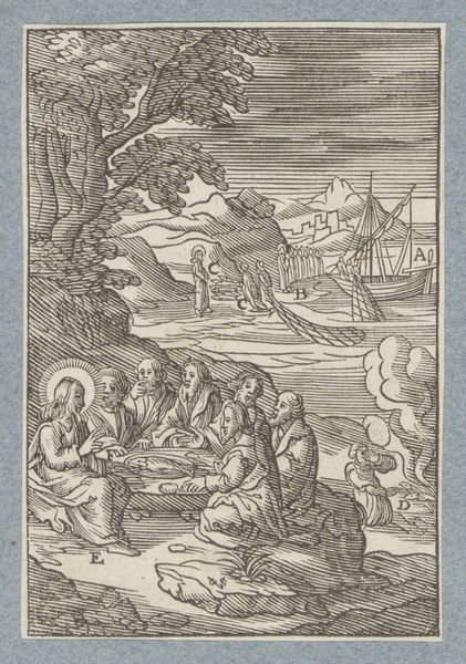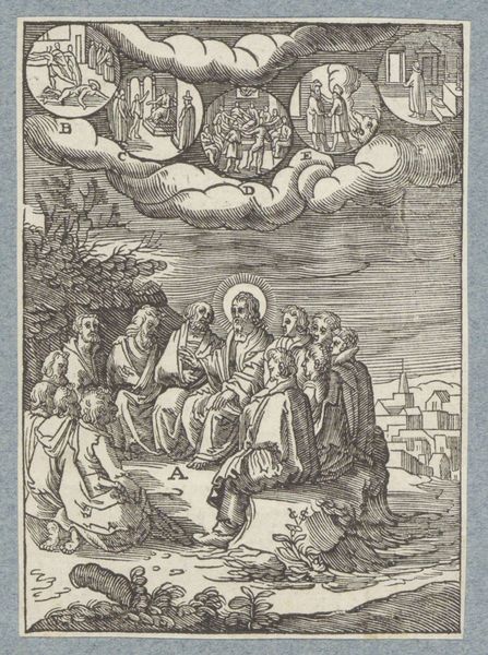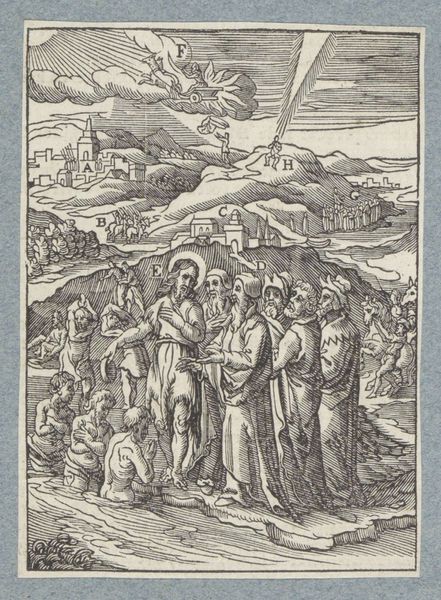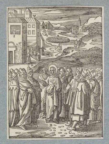 Curator: Let's turn our attention to "Christus geneest een melaatse," or "Christ Healing a Leper," a compelling engraving from 1629 by Christoffel van Sichem II, currently residing at the Rijksmuseum. It immediately strikes me as rather severe in its formal arrangement and rather stark contrasts. Editor: My eye is drawn to the intricacy of the lines – the sheer labor involved. Can you imagine the artisan meticulously carving those details into the block? It speaks volumes about the role of craftsmanship in disseminating these biblical narratives. Curator: Precisely. Van Sichem, firmly within the Baroque style, exploits the stark contrast between light and shadow achieved through precise line work to create an emotionally charged scene. Observe how he uses hatching to build up the dramatic folds of Christ’s robes, thus indicating form. Editor: And note how the landscape is not mere backdrop, but an active participant. The elevated position of the crowd in the background almost feels like it's looking down, reinforcing the idea of Christ's healing as a public spectacle, made for widespread viewing and contemplation through this reproductive print. The act of making, replicating and distributing ensures the message is disseminated broadly. Curator: I am fascinated by the use of space. There are three discrete groupings separated by these topographic shifts. Christ, the leper, and his retinue occupy the lower ground; another set of disciples in the mid-ground; a crowd amassed at the hilltop. The composition directs our gaze towards Christ, and underscores the divine action underway. Editor: Agreed. Thinking materially, engraving allowed for multiple impressions, making religious stories accessible across social classes. The woodblock itself and its endurance, facilitating mass distribution, served almost as a conduit connecting belief to broader society. I think considering the social implications adds such depth. Curator: Yes, it speaks volumes about its role in society. Ultimately, van Sichem’s masterful handling of line, combined with the scene's allegorical content, ensures this print is more than mere depiction—it becomes an exercise in conveying the metaphysical and sacred. Editor: Indeed, by understanding its materials and place in its historical moment, it offers layers of interpretation.