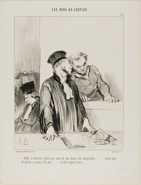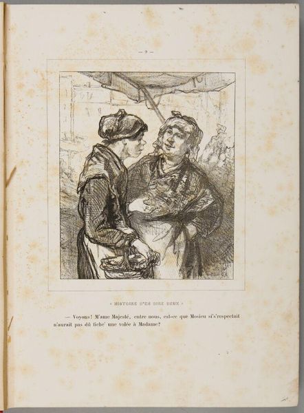 Editor: This lithograph by Honoré Daumier, titled "Check the market...Are our stocks rising?", depicts two men intently reading what looks like a financial newspaper. They seem anxious. How would you interpret this work within its historical context? Curator: Daumier's work often critiques Parisian society, especially the bourgeoisie. Consider the rise of financial speculation in 19th-century France. How might this image reflect anxieties about economic instability and the changing social landscape? The figures appear caricatured, almost grotesque; what statement do you think Daumier is making? Editor: So, it's less about the individuals and more about a broader commentary on the era’s financial culture and its impact on society? Curator: Precisely. This piece speaks to the democratization of the art market and how prints circulated political and social critiques to a wider audience. It's fascinating to consider how Daumier used art to engage with and shape public opinion. Editor: I see it now. It's like Daumier is using humor to address some deeper societal issues. Curator: Exactly! It's a powerful way to make a statement and encourage viewers to think critically about their world.