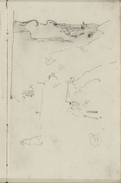 Editor: We're looking at "Studie," a pencil drawing by George Hendrik Breitner, created between 1883 and 1885. It's quite sparse, almost fragmented, but there's a compelling tension between what's present and what's left unsaid. What do you see in this piece, looking beyond its minimalist approach? Curator: This sketch invites us to consider Breitner’s gaze, what he chose to capture and, significantly, what he chose to omit. As an activist lens might perceive it, it raises questions of power dynamics inherent in observing and representing a landscape or, potentially, figures within a landscape. It is not simply about aesthetic appreciation but also an exercise in historical excavation: what sociopolitical context was Breitner working within, and how did that affect his selective rendering of reality? Do the marks here suggest a fleeting encounter, a detached perspective, or something else entirely? Editor: That's fascinating. The detachment you mentioned, I almost see that too in the lack of detail. Is that deliberate or just characteristic of sketches from this period? Curator: I believe the perceived "lack" is intentional, urging us to unpack the relationship between the artist, the subject, and the viewer. The swift strokes can imply not just speed but also a certain power held by the observer, freezing a moment in time. Furthermore, Impressionism, while aesthetically pleasing, often sidelined the struggles of working-class people, focusing on the bourgeoisie. So we must reflect on the absence of the lived experience, labour and urban struggles here. Whose stories aren’t being told? Editor: That gives me a lot to think about in terms of interpreting this drawing. I never would have considered the power dynamics inherent in the "gaze." Curator: Precisely. Art isn’t merely about what we see, but about questioning how and why we see it, considering its role within societal and political currents.