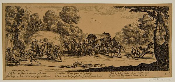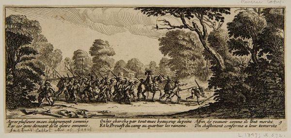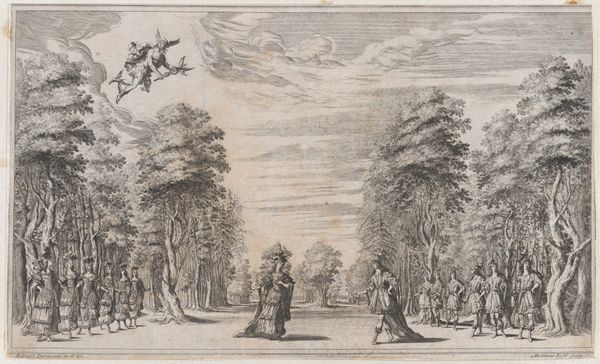 Curator: Matthäus Küsel's print, "Woods of Ida," presents a theatrical scene amidst a meticulously rendered landscape. The etching technique is quite striking. Editor: It feels dreamlike, almost unsettling. Figures arranged like chess pieces, and something fantastical happening up above in the sky. Curator: Exactly! This print showcases the consumption of allegorical performances by privileged audiences. The labor of the artist and printmakers becomes part of the narrative. Editor: I see it more as a portal, a gateway to a forgotten story. The delicate lines and the sheer density of figures create a sense of overflowing imagination. Curator: Perhaps we can agree that these prints served as both a cultural artifact and a commodity. Editor: A commodity wrapped in a dream, indeed.