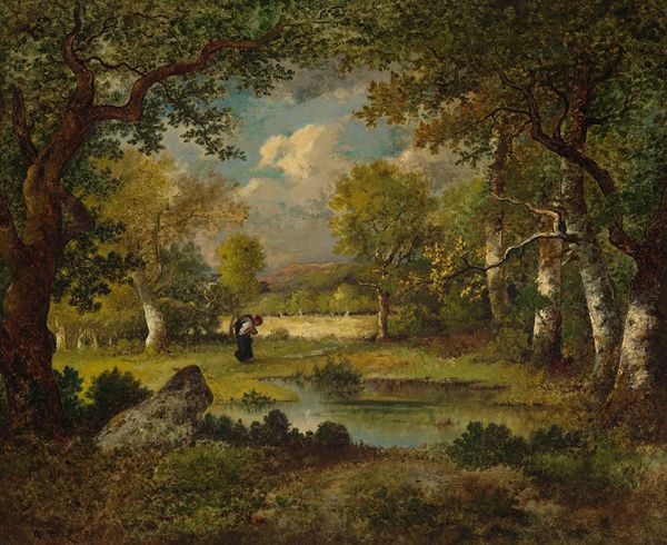 Editor: Here we have "Landscape near Hilversum," an oil painting by George Jacobus Johannes van Os, sometime in the 1820s or 30s. It’s a lovely pastoral scene. The detail in the trees is incredible, but what really catches my eye is how the artist captured the light filtering through the clouds. What are your initial thoughts on this work? Curator: My immediate reaction concerns the artist's engagement with materials readily available within his environment, juxtaposed with the demands of a market economy. The very pigments, likely sourced locally, were then skillfully applied to canvas – a manufactured good signifying trade and industry. Consider the societal pressures van Os navigated. Do you see any potential critique, however subtle, embedded in his idyllic portrayal? Editor: That's an interesting perspective. I hadn't thought about the contradiction between the natural subject matter and the manufactured materials. I guess I was too caught up in the romantic depiction of the landscape! Curator: Precisely! Note the laborious technique employed to achieve such realism. Each brushstroke represents time, effort, and skill – resources that were not equally accessible to all during that period. How might we interpret this abundance within the artwork itself? Is it merely aesthetic, or could it signify a statement about land ownership and resource distribution? Editor: I see what you mean. It does raise questions about who has access to this idealized version of nature. Thanks, I'm definitely going to look at landscapes with a different perspective now! Curator: Wonderful! Thinking critically about the materials and methods behind art helps us unravel broader societal narratives.