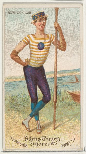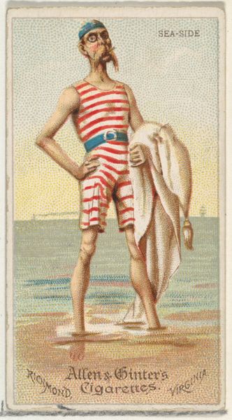 Editor: This is Patrick Fitzgerald, "Pedestrian", from the Goodwin Champion series, printed in 1888, part of a promotional series for Old Judge and Gypsy Queen Cigarettes. It appears to be an etching. The subject’s proud stance, arms crossed, has an almost heroic quality, yet the bright colors and his somewhat unusual outfit give it a strange edge. How do you interpret this work in the context of its time? Curator: Well, consider how consumer culture and advertising were transforming in the late 19th century. Cigarette cards like this one weren't just about selling tobacco; they were about associating products with aspirational figures – in this case, a prominent athlete. Do you notice the rather exaggerated musculature, the slightly comedic presentation? Editor: Yes, it feels… cartoonish almost. Curator: Precisely! That caricature wasn't just incidental. These images served a dual purpose: to promote a brand *and* to democratize access to celebrity. Common folk could possess a likeness of a sporting hero. It also solidified ideas about athleticism. Does this inform or challenge prevailing social norms or politics? What happens when sport is seen as spectacle and consumption? Editor: That’s really interesting. So, the seemingly straightforward image actually speaks volumes about the era’s consumer culture and ideas about celebrity. It's making me reconsider how I see advertising even today. Curator: Exactly! Seeing this figure packaged with a consumer good provides some nuance when examining the popular cultural of this moment.