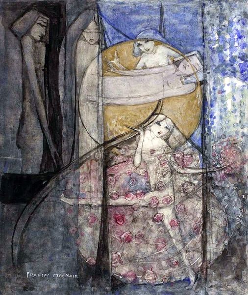 Curator: Frances Macdonald's "The Choice," painted in 1886, draws us into a world thick with symbolism, a key feature of the Art Nouveau movement. It’s currently housed here at the Walker Art Gallery. What's your immediate take on it? Editor: Ethereal. It feels like peering into a dream, or maybe a half-remembered myth. The colors are so muted, almost ghostly. Are they trapped in a memory? Or are they a symbol of choosing a path and having to leave others behind? The figures and roses swirl together... it is like an eerie perfume bottled in a painting! Curator: The roses are key! They're densely layered. We see these repeated throughout the canvas; and Macdonald’s decision to depict them signals Victorian notions of femininity and beauty, intertwined with an undercurrent of decay and, well, a sharp awareness of the limitations placed on women. Editor: It almost feels like the roses are trapping the figure rather than her existing amongst them. Speaking of which, what do you make of those stark figures in the background? They could be sisters, spectres from another time. There is one looking up. Longing to escape their static stance. What are they meant to symbolize? Curator: Many see them as representing societal expectations, maybe the constraints placed on the central figure, judging her possible choices. That string of golden dots… It is easy to interpret them as representing opportunity but there also appears a heaviness, an un-ignorable weight. The use of the nude figure also touches upon ideals of beauty versus vulnerability, as this canvas represents one of the earliest forays into feminist art. Editor: So, a lot of expectation and constraint swirling amongst all the rose imagery... Even today you feel the power of what she managed to pull together in her artistry. The ambiguity makes it perversely timeless. Even in the whispers of the painting, it has a lot to say about the idea of options versus the reality of what freedom we have. It gives pause. Curator: Absolutely, it is a wonderful demonstration of visual encoding to carry weighty context through images. These were themes MacDonald continued to explore throughout her work. Editor: Exactly, something in the mood clings to you even after you turn away. An amazing way to summarize all the ways that a choice can resonate... across a life and even across time itself!