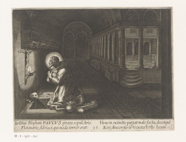 Curator: Today, we're examining a print entitled "Marcus de kluizenaar" or "Marcus the Hermit," created after 1594 by Charles van Boeckel. Its delicate lines draw us into a scene of quiet contemplation. Editor: Indeed. I’m struck by the composition—how the artist uses a stark contrast between the shadowed grotto on the left and the luminous landscape on the right. The figure feels almost compressed, a formal echo of the cloistered life. Curator: Absolutely. Note the careful rendering of the light source, presumably divine, illuminating Saint Mark as he writes. Observe the semiotic weight given to the quill. It links Mark to divine revelation through writing, transforming mundane script into sacred utterance. Editor: Yes, but even more than just “writing,” this print makes an argument about spiritual vocation. Mark as an icon—pen in hand, bare feet in direct connection with nature and a crucifix to show his devotion and suffering. The plants intertwined around the cross—aren’t they suggestive of both physical suffering and renewal of nature, as symbols for the same experience? Curator: A provocative reading. One cannot dismiss the use of the landscape. See how Boeckel interweaves Christian symbolism with established iconographic symbols to produce a richer message—melding human history and personal expression through image, creating a dialogue for those both in the spiritual world and outside of it. Editor: This blending becomes so prevalent in baroque art, which uses drama to display these values of humility and purpose—but its effectiveness relies not only on its artistic quality but on the audiences cultural conditioning that provides common meaning. What does this piece say to people today about purpose? Curator: These kinds of dialogues between history and spirituality, symbol and expression, allow the observer and artwork to both inform one another, through line and form that transcend the boundaries of Baroque aestheticism. Editor: This image asks for sustained and considered readings, not simply decoding obvious visual clues but connecting more closely to both cultural understanding and formal execution.