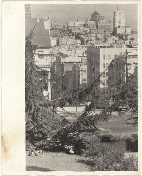 Curator: This is William Edward Dassonville's photographic print, "Portsmouth Square, San Francisco." It captures a familiar urban scene. What's your initial take? Editor: It's melancholic, almost ghostly. The buildings loom, and even the park feels a bit like a forgotten memory. There's a stillness that's unsettling. Curator: Indeed. Portsmouth Square holds significant cultural memory for San Francisco, being the city’s original plaza. The framing emphasizes nature and the built environment. Editor: The contrast feels intentional, like a visual representation of the tension between nature and human development, or perhaps the ephemeral nature of progress itself. Curator: Absolutely. The park embodies a kind of resilience. It's a green space amidst the concrete, a symbol of continuity within a constantly evolving urban landscape. Editor: I’m struck by the lack of people. It heightens the feeling of solitude and contemplation, inviting the viewer to reflect on the city's past and present. Maybe it's a warning, too. Curator: A warning or perhaps a quiet meditation. It’s a scene worth contemplating. Editor: Yes, a photographic urban poem.