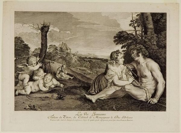 Curator: Let's explore Carlo Domenico Melini's print, "Two children of Prince Turenne." What are your initial thoughts on its form? Editor: It's intriguing. The contrast between light and shadow is very pronounced, and the composition leads my eye directly to the figures. What do you see in the stark juxtaposition of light and shade? Curator: Observe how the artist employs chiaroscuro, a play of light and shadow, to model the figures, imbuing them with volume and presence. This contrast not only defines form but also dictates a narrative, separating the subjects from the shadowed background. Notice how the gazes of the two children also adds to the narrative. Editor: That makes the image's form feel more intentional, not just a record, but a carefully constructed scene. Curator: Precisely. The formal elements work together to create a reading of social portraiture. Editor: I hadn't considered how the artist used those elements to convey that. Thanks for illuminating the formal construction.