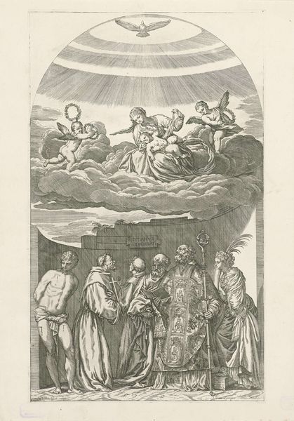 Editor: This is "Johannes de Doper spreekt met vier mannen," or "John the Baptist speaking with four men," an engraving made by Hans Liefrinck in 1553. The figures look serious, perhaps contemplative. The details in the landscape are fascinating, contrasting with the simplicity of the men’s robes. How do you interpret this work within its historical context? Curator: This print offers a glimpse into the social and religious tensions of the 16th century. Consider the Northern Renaissance backdrop: the Reformation is in full swing. How might Liefrinck's portrayal of John the Baptist, a figure of radical preaching and social critique, resonate with audiences navigating these tumultuous times? Editor: That's interesting, especially in how John the Baptist challenges established norms. It appears he's directly addressing these men... do you think this could be interpreted as an act of defiance against religious authority? Curator: Absolutely. The setting itself contributes to this narrative. Instead of placing the scene within a grand cathedral, Liefrinck situates it in a rugged, natural environment. This emphasizes the idea of a spirituality rooted outside the confines of traditional institutions, resonating with Reformation ideals. What does that visual decision mean to you? Editor: That makes so much sense! The figures are very human and humble within this wild landscape. I initially saw the piece simply as a biblical scene, but you’ve illuminated how it interacts with Reformation-era politics and spirituality. Thank you! Curator: The layers of context are always there, enriching the way we see the past and understand the continuing narratives about power, religion, and individual agency today.