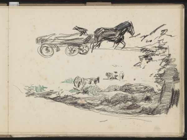 Curator: What a delightful snapshot of a bygone era. We're looking at "Fietser op een pad langs een weiland," or "Cyclist on a Path Along a Meadow," by Gerrit Willem Dijsselhof, likely created between 1904 and 1906. It's a pencil drawing, quite unassuming but rich in narrative. Editor: You know, it has the feeling of catching a moment fleetingly. A really quick sketch—not trying to be polished or monumental. Just there. It makes me think about that liminal space between seeing and understanding. What does it make you feel? Curator: It certainly conveys a sense of everyday life, though one far removed from our current pace. I'm fascinated by how Dijsselhof captures the various modes of transport—the horse rider in the distance, the farmer with oxen, and then the cyclist, perhaps a sign of modernity creeping into the landscape. How do these folks participate in this painting? Editor: All vying for space. No clear road yet to handle any sort of modern vehicle, or person. All are moving within that natural scene in tandem. I like this sense of multiple rhythms occurring all at once. It also gives a nod to these subtle class distinctions too, doesn’t it? Curator: Absolutely. The imagery touches upon questions around urbanization, societal change, and how different socio-economic groups navigate shared spaces. Dijsselhof created during a time of immense change in the Netherlands. His interest in design also surfaces to the foreground within the piece. Editor: The pencil work, almost rushed in places, emphasizes that ephemeral feel even further. The perspective and details create an immersive world, a pastoral scene caught right before industrialization began steamrolling these places, I bet. It has this slightly bittersweet nostalgic flavor. Curator: Precisely! Dijsselhof, deeply involved with the Arts and Crafts movement, frequently combined art with decorative elements, seen in how he composed the scenes. The drawing provides a look into the Dutch landscape but serves also a thoughtful commentary on societal shifts, even if unintended. Editor: To wrap up: Dijsselhof delivers this gentle piece as a quiet observer to what was an industrial time on the edge of this new cultural lens being set upon Europe and the Netherlands, making it much more dynamic that the typical drawing might first present. Curator: I agree. Its unassuming appearance hides a complex meditation on the intersection of progress and tradition. A fitting piece to consider as we reflect on our own rapidly changing world.