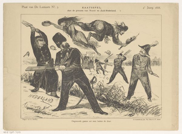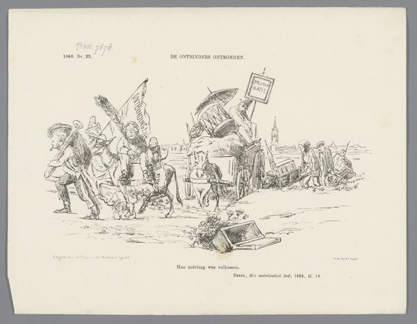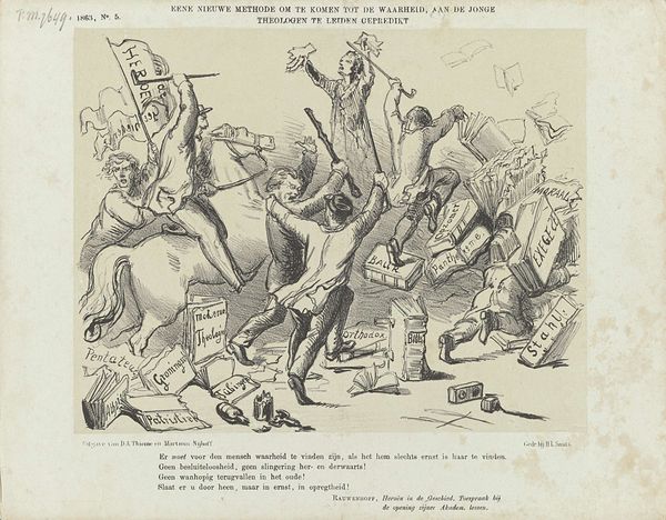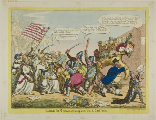 Curator: This satirical print, titled "The Deplorable State of America, or Sc___h Government", comes to us from 1765 and is currently held at the Metropolitan Museum of Art. Created anonymously, it employs engraving and ink on paper to deliver its political message. It’s quite striking. Editor: Striking is right! It's a dense scene, feels almost chaotic at first glance. The lines are so sharp and precise, giving it this acidic, biting quality. You can practically feel the simmering anger just radiating off the paper. Curator: Precisely. The artist is channeling the burgeoning discontent in the American colonies toward British policies. You see Britannia collapsed on the ground and a Native American figure warding off attacks with bow and arrow. This echoes sentiments against what they considered a Scottish government meddling with the colonies’ affairs. Editor: And what's fascinating is the means. Engraving as a relatively accessible mode of reproduction, quickly disseminated and widely circulated, was critical to stirring revolutionary fervour, turning sentiment into action by those that traded or worked as craftspeople with their own materials. Curator: Absolutely. Symbols here would have been immediately recognizable to contemporary viewers: the head in the sky represents injustice raining down. Note also how classical and allegorical figures are being used to express the problems and frustrations specific to the political reality of that historical moment, especially using visual language to establish continuity of this crisis to earlier ones. Editor: The materials themselves speak volumes. Ink, paper, engraving tools... all relatively common, accessible tools to critique power at that moment. It’s about the immediacy and relative ease of production. The level of skill ensures both longevity of the piece and impact of the statement. Curator: Consider that "Deplorable State" title too. It underscores how profoundly some felt about these changes and challenges to their way of life. It’s heavy, and filled with portent. Editor: For me, viewing this today highlights the tangible power of print and accessible mediums and also emphasizes a need to address access to resources needed for revolutionary acts. It forces a crucial dialogue about social context and distribution methods to reach desired goals. Curator: Agreed. Revisiting this image connects us to a potent moment of tension. The use of imagery crystallizes this specific political gripe. Editor: I appreciate witnessing those materials used in such a transformative and politically charged context and, for both us, recognizing it also points to more current considerations.