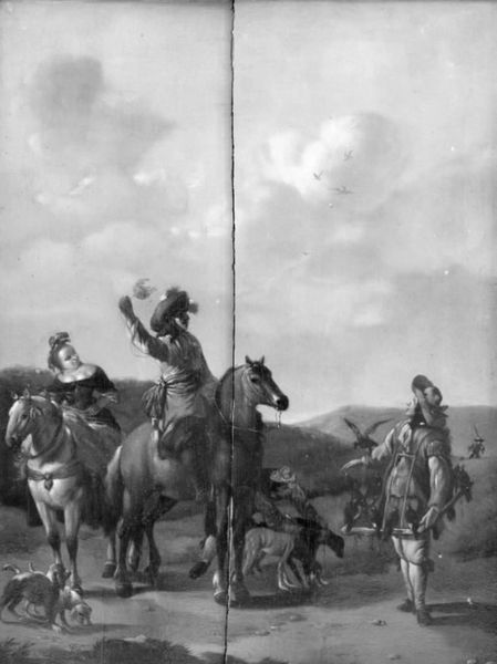 Editor: This is "The Out-Post" by Ernest Meissonier, circa 1880. It looks like it's charcoal and graphite. I'm immediately drawn to how somber the entire piece is, despite seemingly depicting a serene landscape with a soldier on horseback. How do you interpret this work? Curator: From a materialist perspective, this artwork reveals a fascinating tension between its intended subject – romanticized military life – and the economic realities of its creation. Consider Meissonier’s meticulous process, the laborious hours spent rendering detail. This contrasts sharply with the industrial-scale production of weaponry that made such "heroic" poses possible. Editor: That's interesting. So you’re saying the means by which this image exists—charcoal, graphite—reflects, or perhaps even contradicts, the narrative? Curator: Exactly. Think about the French societal context. The post-Industrial Revolution. Art becomes a commodity alongside mass-produced goods. This drawing, with its crafted touch, becomes a critique of the industrial war machine it depicts. What does the texture of the charcoal tell us about the artist's hand versus the cold steel of the rifle? Editor: It highlights a disconnect, maybe even a kind of manufactured nostalgia. The romantic ideal versus the grim reality enabled by industrial warfare. Curator: Precisely. And examining the paper itself - what kind of paper, how accessible was it - reveals social stratifications related to art production and consumption during that era. Ultimately, focusing on materials unveils these underlying societal tensions, disrupting traditional narratives around warfare. Editor: I never considered looking at it that way. Focusing on the actual materials adds a layer of critique I hadn’t recognized before. Thanks for this insight! Curator: It is a reminder that art isn’t created in a vacuum but is inextricably linked to its material and social circumstances.