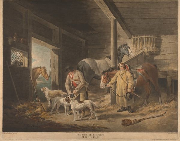 Wouter Verschuur made this print of horses and dogs in a stable, using a technique that renders every detail visible. The printmaking process, likely etching or engraving, demanded meticulous labor. The artist would have used specialized tools to incise lines into a metal plate, which was then inked and pressed onto paper. Look closely, and you will see the fine web of lines that build up the image. This wasn’t just about replicating an image, but about a whole culture of skilled work. The material of the print itself – paper, ink, and metal – speaks to a world increasingly shaped by industry and trade. The ability to reproduce images, like this scene of working animals, highlights the changing relationship between humans, animals, and labor in the 19th century. The value lies not only in the final image but also in the process itself.