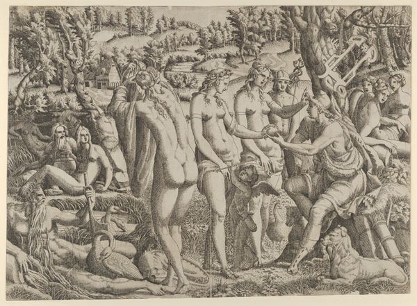 Giovanni Jacopo Caraglio created this engraving, "Wedstrijd tussen de Muzen en de Pierides," sometime before his death in 1565. The composition is organized around a central body of water. We see two groups of figures placed on either side of this divide: to the left, the Pierides, and to the right, the Muses. The structure is divided and symmetrical, yet there is also a sense of dynamic movement. The figures display the Mannerist aesthetic characterized by elongated forms. The linear quality of the engraving, typical of the period, allows for detailed rendering of musculature and drapery, which adds depth to the characters and their interactions. The engraving technique itself is crucial here. Lines create volume and shadow, but also define the emotional tenor of the scene. The stark contrast between light and shadow highlights the tension between the competing groups, suggesting a subtle commentary on the complexities of artistic rivalry. This artwork presents a sophisticated discourse on power and artistic identity.