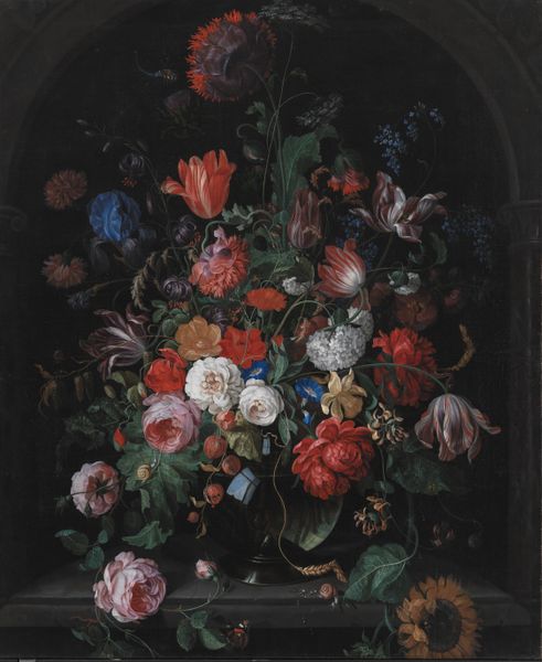 Jan Davidsz de Heem created this still life with oil on canvas, featuring flowers in a glass vase. These floral displays were popular in the Dutch Golden Age, reflecting the Netherlands' booming economy and global trade. Exotic flowers like tulips, highly sought after and expensive, symbolized wealth and status. The detailed realism of the painting showcases the artist's skill, but also the growing importance of scientific observation and documentation. The inclusion of insects and a snail can be interpreted as a vanitas motif, reminding viewers of the transience of life, even amidst prosperity. To understand De Heem's work, we look at the economic and social conditions of the time. Archival research into Dutch trade and botanical studies would reveal the cultural significance of these flowers, and how art reflected the values of a society in transition. The meaning of art is always contingent on its social and institutional context.