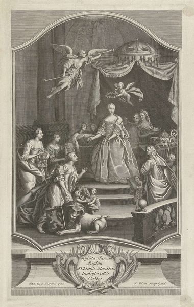 Simon Fokke created this etching in 1737, titled "Allegorie op het bedrog van Aron Abrams." The artwork is a commentary on a specific historical event involving Aron Abrams, likely a figure known for deceit or fraud during that era. Fokke uses allegory to critique social and ethical issues. The scene is filled with symbolic imagery designed to reveal hidden truths about the characters involved. The theatrical staging and allegorical figures—like the cherubs at the bottom—suggest a narrative about exposing trickery. Consider how Fokke, as an artist, positions himself as a moral judge, using his art to dissect and comment on the actions of individuals within his society. This piece is a blend of artistic skill and social critique, reflecting the artist's engagement with the moral landscape of his time. It invites us to reflect on the cost of deception and the role of art in uncovering societal truths.