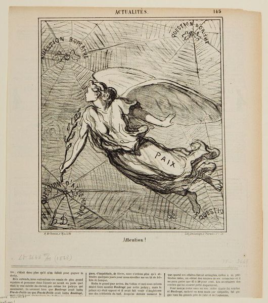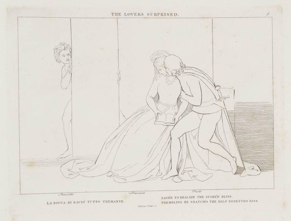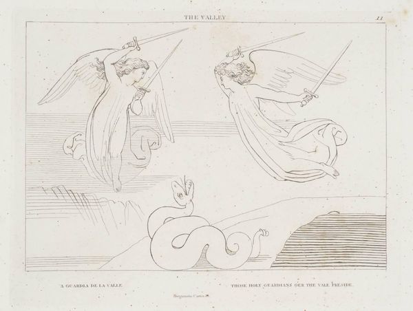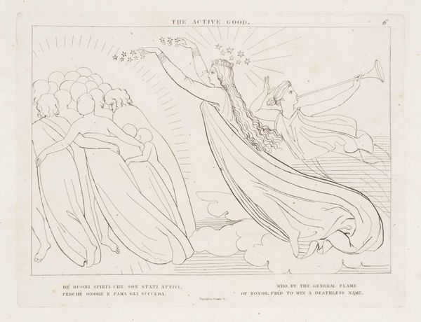 Curator: Here we have John Flaxman's "Tomb of Anastasius," part of the Tate Collections. It's an intriguing, linear work. Editor: It feels like a fleeting dream. The lines are so delicate, almost ethereal, rendering figures dissolving into the clouds. Curator: Flaxman employed line engraving to create this image. The process itself—etching, the careful application of acid—mirrors the somber subject matter. Editor: Notice how the figures, likely mourners, cling to the inscribed stone? Anastasius Papa Quarto. What emotional burden is conveyed by this imagery? Curator: Consider also the materiality. This was a print, intended for wider circulation. Death made reproducible, consumable. Editor: Indeed. Yet, the overall effect is so otherworldly, that the piece offers a delicate meditation on loss, even if mass-produced. Curator: A fascinating confluence, isn't it? Mass production techniques capturing a moment of grief. Editor: It really makes you reflect on how symbols and production can intersect.