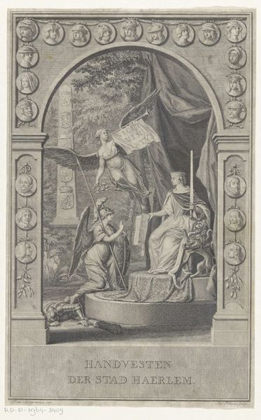 Reinier Vinkeles created this print in 1765 as a title page for a book on Arab history. But the scene depicted seems to reflect the Dutch present more than the Arab past. The engraving shows an allegorical figure of a woman, armed with a spear, standing guard over a group of women and children who are studying and writing. In the background, we see an idealized view of an Arab city. The scene is framed by a curtain and palm trees, suggesting a theatrical performance. This image creates meaning through a combination of visual codes and cultural references. The armed woman represents the Dutch Republic, a nation that defined itself through military strength and commercial power. The women and children represent the domestic sphere, where knowledge and virtue are cultivated. This print reflects the values of the Dutch Enlightenment, which emphasized reason, education, and civic engagement. To better understand it, look into the history of Dutch printmaking and the role of images in shaping public opinion. This artwork reminds us that art's meaning is always tied to its time and place.