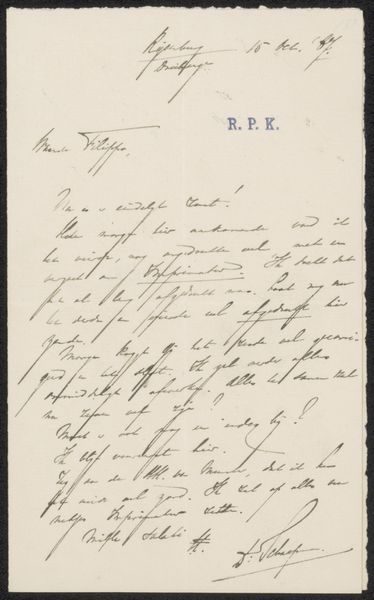 Curator: This drawing, believed to have been created between 1887 and 1889, is entitled "Brief aan Filippo Tessaro." It is the work of Herman Johannes Aloysius Maria Schaepman. Editor: My first impression? Intimate. It feels like discovering a secret missive, penned with delicate, flowing ink. You can almost sense the hand that wrote it. Curator: It's fascinating how Schaepman chose the media – a simple pen and ink on paper. The ready availability of such materials suggests a democratisation of the creative process, breaking down barriers. This wasn't a commissioned masterpiece; it was a personal communication. Editor: I love the idea of access. Of the artwork, like poetry, finding its way onto anything, anytime. See how the text almost dances on the page! It's not just information; it's expression. You sense a relationship to the material. Curator: And it tells us something about networks of exchange. The letter itself suggests a level of literacy and communication within a particular social group. The very act of writing, delivering, receiving, represents labour, materiality, consumption. Editor: Definitely! It makes you consider the effort behind writing. Today, a message disappears into cyberspace; this has a weight, a tangibility. There is time to contemplate what someone writes. I see the fragility, too. Think of all that time lost. The passion that fades. I imagine this was sent, a gesture of a hand on a shoulder. But now it's something quite, quite other. Curator: Agreed. The constraints, then, paradoxically provided a fertile ground for artistic creation. Editor: It seems even a note dashed off in pen and ink can offer glimpses into lost connections, long dead thoughts. Amazing how potent they become. Curator: Yes, exactly that: from material simplicity emerges something rather meaningful and valuable now.