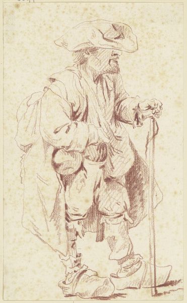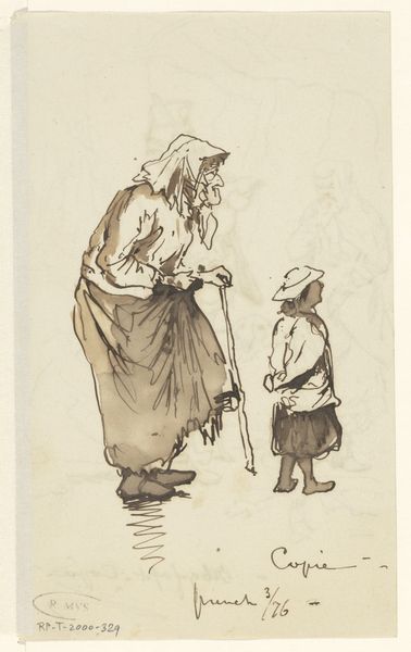 Wilhelm Marstrand made this small drawing, titled 'Old Swedish Woman and Little Girl,' using pen and ink. Marstrand, who lived from 1810 to 1873, was working in a period of significant social change. The drawing depicts two figures whose clothes mark them as poor. The old woman, possibly a grandmother, holds what appears to be a bundle of textiles, a burden carried along with her history. The girl stands slightly apart, her arms crossed as if guarding herself from the world. Marstrand often focused on everyday life, offering glimpses into the lives of ordinary people. Consider how the artist uses line and form to convey a sense of dignity in the face of hardship. What does it mean to represent these figures with such attention to detail? Is he challenging the traditional narratives of the time by emphasizing the humanity and resilience of those living on the margins? This drawing asks us to look closely at the lives of women and girls, and reflect on their stories.