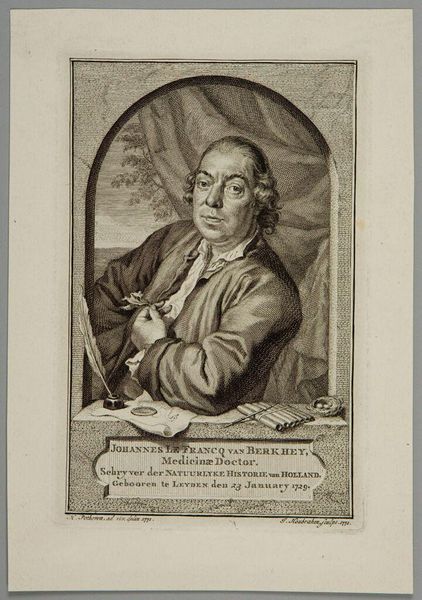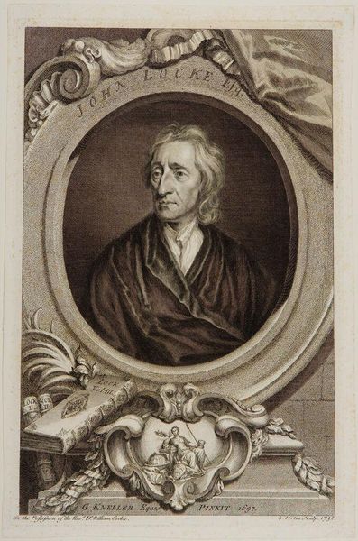 Editor: This is Jacobus Houbraken’s portrait of Thomas Otway, currently held at the Harvard Art Museums. The lyre and theatrical mask suggest a man of the arts. How do you think this portrait reflects Otway's public image? Curator: It's interesting how Houbraken frames Otway within these symbols of artistic endeavor, isn't it? But consider the institutional context: this wasn’t just a personal tribute. Prints like these circulated widely, shaping and reinforcing public perception of figures like Otway. How does that affect our understanding of it as a representation? Editor: I hadn't thought about the role of print in shaping public image back then. So it's less a personal portrayal, and more a calculated construction of Otway’s legacy? Curator: Precisely. It highlights the power of visual media in constructing historical narratives, and reinforces how the image of a playwright might be intentionally crafted for public consumption.