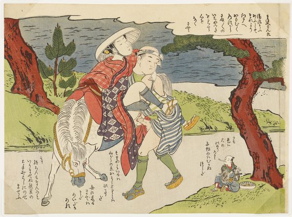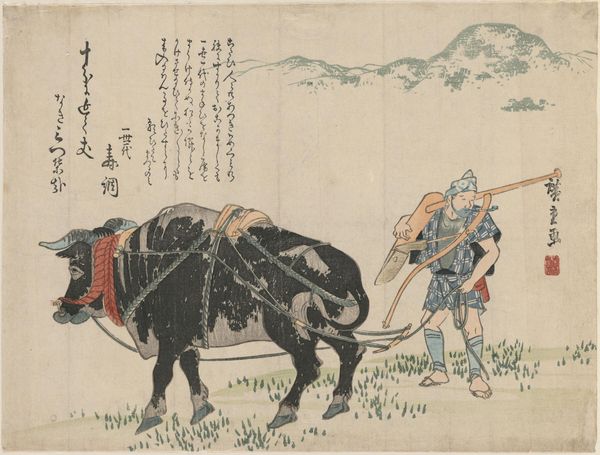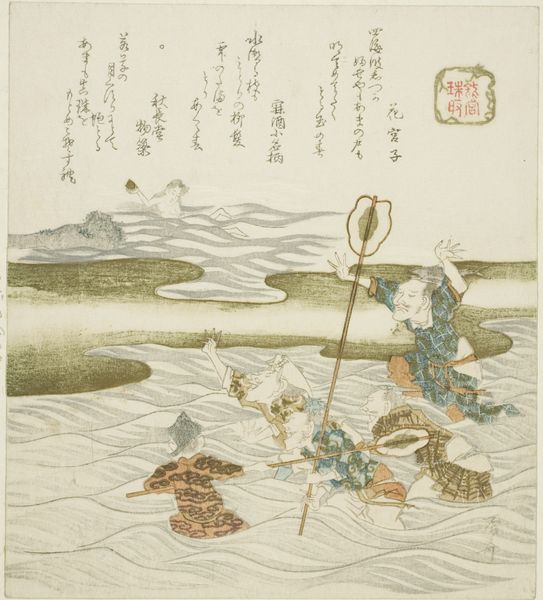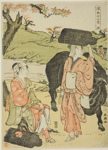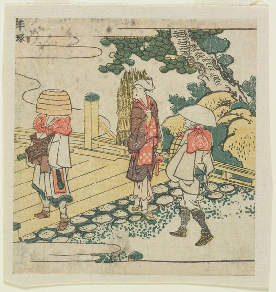 Editor: This is "Three Men by a River" or "ChiryÅ«" by Katsushika Hokusai, from his series "Exhaustive Illustrations of the Fifty-Three Stations of the TÅkaidÅ." It’s a woodblock print on paper, and I’m struck by how it depicts everyday labor. What can you tell me about the materials and the process here? Curator: Consider the woodblock print itself. How does the medium shape our understanding of accessibility and distribution of images in 19th century Japan? Editor: That makes sense! The prints could be widely shared because they were relatively easy to produce. Curator: Precisely! So, how does the artist’s choice of this medium democratize art viewing? Editor: It brings art to the masses. I’d never thought about it that way before. Thank you! Curator: My pleasure!