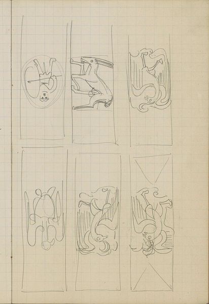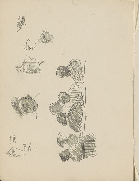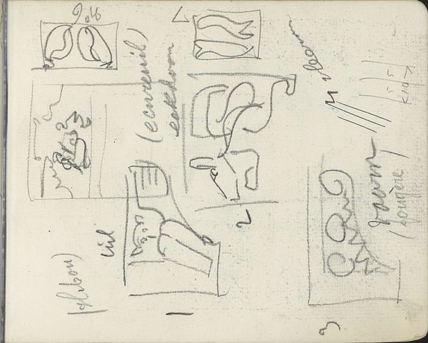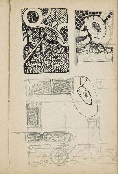 Curator: What strikes me right away about this page from Reijer Stolk’s sketchbook, created around 1919, is the sheer exuberance. It's like peering into a mind brimming with ideas, nature, and letters all clamoring to take shape. Editor: I'm immediately drawn to the relationship between ornament and functionality suggested here. The Art Nouveau style evident in the leaf motifs contrasts sharply with the blocky letter designs, revealing a tension between aesthetics and utility that defines much of early 20th-century design. What's your take on this potential struggle, Curator? Curator: Struggle is an interesting word for it! Maybe "dance" is more fitting. To me, the combination isn't a battlefield but rather a sandbox. Stolk seems gleefully unconcerned with rigidly defining where the art stops and the function begins. Those blossoming flower sketches, playfully jumbled with the planned ornaments, lend this to the reading of artistic play. Editor: I'd agree to a playful negotiation, not an outright struggle, as I see an attempt to synthesize seemingly disparate elements, echoing the socio-political efforts toward finding unity after the first World War through design, especially given its dating to 1919. Consider the social function of such design. Curator: It certainly does feel optimistic, and maybe you're right: I’m a sucker for thinking artists are just having fun! But perhaps Stolk was deliberately forging a connection between natural beauty and the burgeoning industrial world—making peace with machinery and organic form, all with his pen and paper. It's beautiful to think that art-making could have a purpose. Editor: Absolutely, and this blending offers an insight into the design aspirations of the era, where ornamentation wasn’t merely superficial but intertwined with a push toward democratizing design access. Sketchbooks such as this illuminate not just individual artistic processes but the wider movement seeking accessibility in aesthetics in everyday life and, I argue, beyond. Curator: So, it's more than pretty pictures; it's a quietly radical statement? I’ll take that with me! Editor: It certainly could be viewed that way, yes, by recognizing design as intrinsic to social and political transformation. And isn't that what makes revisiting works such as this, especially ones initially as straightforward-seeming as a sketchbook, so continuously enriching?