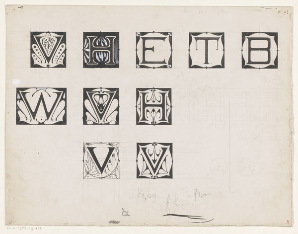 Editor: Here we have "De letters van het alfabet, waarvan enige versierd zijn met ranken," or "The letters of the alphabet, some of which are decorated with tendrils" by Antoon Derkinderen, created between 1869 and 1925, rendered in pencil on paper. It has the look of a study, with letters carefully sketched out, some adorned with delicate foliage. It makes me wonder if it's a page from a sketchbook used to design a typeface. What can you tell us about it? Curator: This work speaks volumes about the artistic climate of the late 19th and early 20th centuries. The Arts and Crafts movement was in full swing, advocating for a return to handcrafted artistry in response to industrialization. This alphabet study reflects that ethos. Editor: How so? Curator: Consider the time period. There was increasing alienation and exploitation caused by industrial labor models. Artists saw beauty in craftsmanship. The attention to detail and the inclusion of organic, hand-drawn embellishments… These elements elevate what could have been a simple exercise in typography to a celebration of artisanal skill. Derkinderen's focus on integrating nature within these constructed forms ties it to a larger socio-political stance. The politics of the image here celebrate an anti-establishment worldview through design. Do you see the connection? Editor: Yes, I think so. The careful hand lettering is in itself a statement about valuing the handmade. The delicate details bring to mind illuminated manuscripts, harking back to pre-industrial modes of creation. Curator: Exactly! It highlights a nostalgia and cultural commentary. These public displays celebrated craft skills as political stances against mechanized reproduction. Editor: It's fascinating to consider this as more than just a simple sketchbook page. I never thought of typography as something that could carry social and political meaning. Curator: Art often exists within a wider cultural framework, and this piece invites us to consider the social role and intention behind its creation.