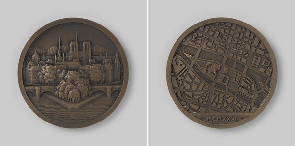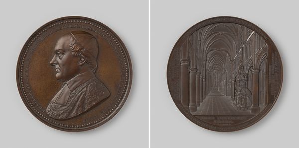This bronze medal depicting the Notre Dame of Antwerp was created by Leopold Wiener in the 19th century. Wiener, as a Jewish artist in Europe, navigated a complex social landscape, where religious identity often intersected with artistic expression. The medal presents two distinct views: the exterior facade and the interior nave of the cathedral. On one side, the architectural might of the cathedral looms, surrounded by inscriptions. On the other, the interior reveals a seemingly endless colonnade, drawing the eye into the cathedral's depths. Cathedrals such as Notre Dame, were potent symbols of cultural identity, deeply intertwined with narratives of faith, community, and power. Wiener’s choice to represent both the exterior and interior invites reflection on the cathedral’s dual role as a public monument and a private spiritual space. How might Wiener, as an artist of Jewish faith, engage with the representation of a Christian cathedral? What dialogues emerge from the juxtaposition of exterior grandeur and interior reflection? This medal encourages us to consider the intricate ways in which architecture embodies collective memory and personal experience, and to reflect on how our identities shape our perception of such spaces.